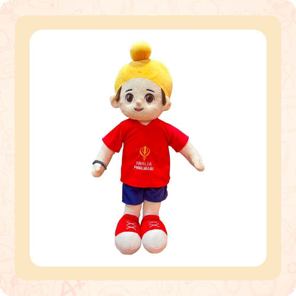 Cute Sikh Boy Soft Toy by Khalsa Phulwari is a wonderful friend that adds warmth and happiness to any situation! The outfit's bright colors and elaborate patterns reflect the Sikh community's rich culture. The Patka (Turban) highlights the diversity of the Sikh character and lends an additional element of authenticity. This plush buddy, made from premium, ultra-soft fabrics, is not only visually appealing but also extremely cuddly. With this adorable and cuddly addition to your soft toy family, embrace the joy of Sikh pride!